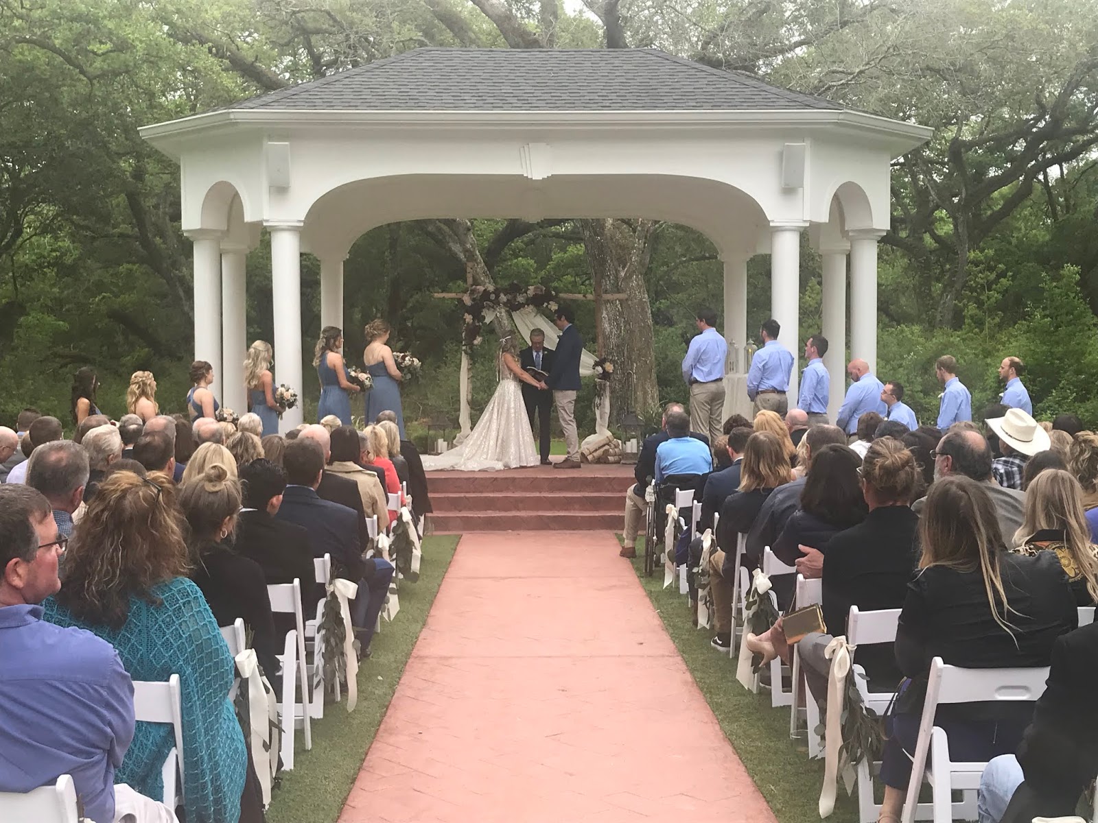 The ceremony was held outside at a gazebo, with a gorgeous wood arch